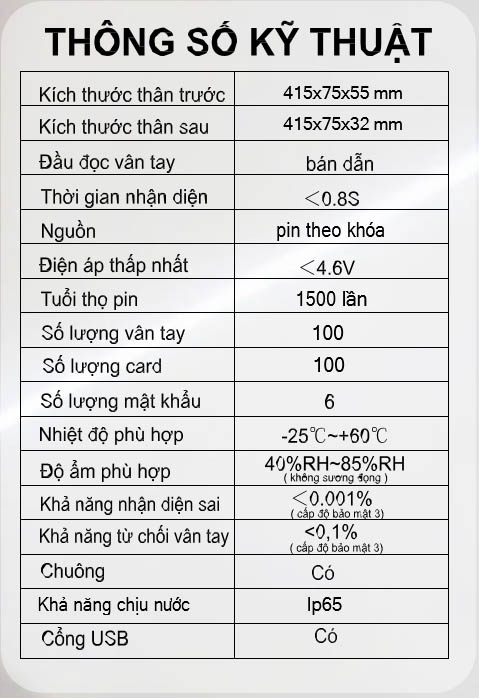 - Mở khóa dự phòng: Có chìa cơ hoặc nguồn kích pin ngoài trong trường hợp khẩn cấp.